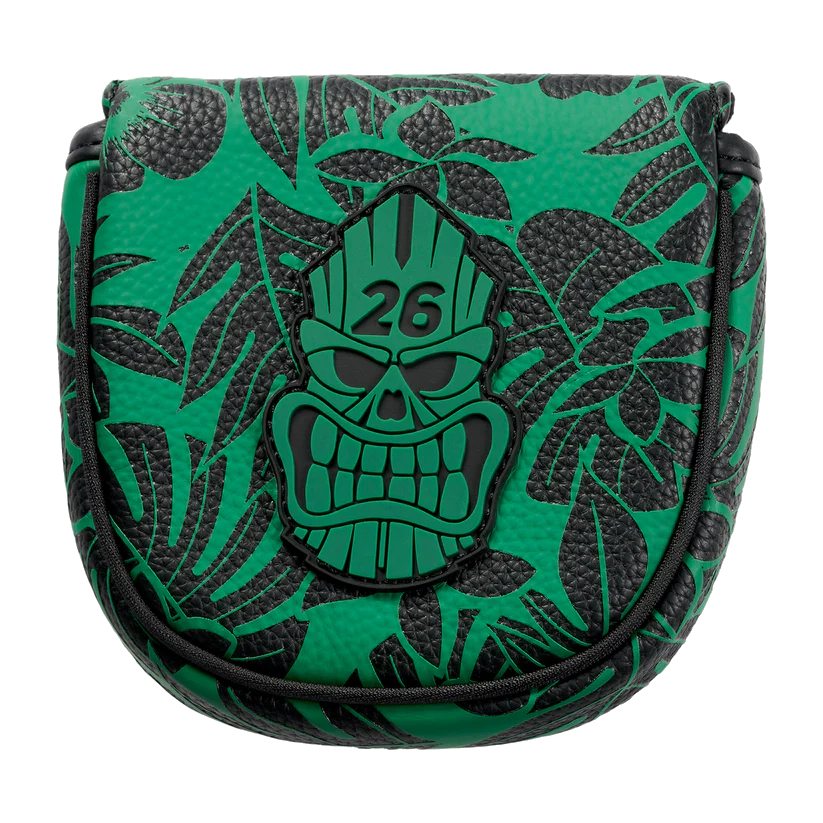 All hail the tiki! Our Darkness Tiki Skull Mallet Headcover is ready for fun on the green. Wrapped in our Darkness Tiki print embroidered in green and black, it’s made with a durable polyurethane exterior and plush velour interior to protect your putter from scratches. An interior QuickStick™ cart magnet secures it to your golf cart when not in use.